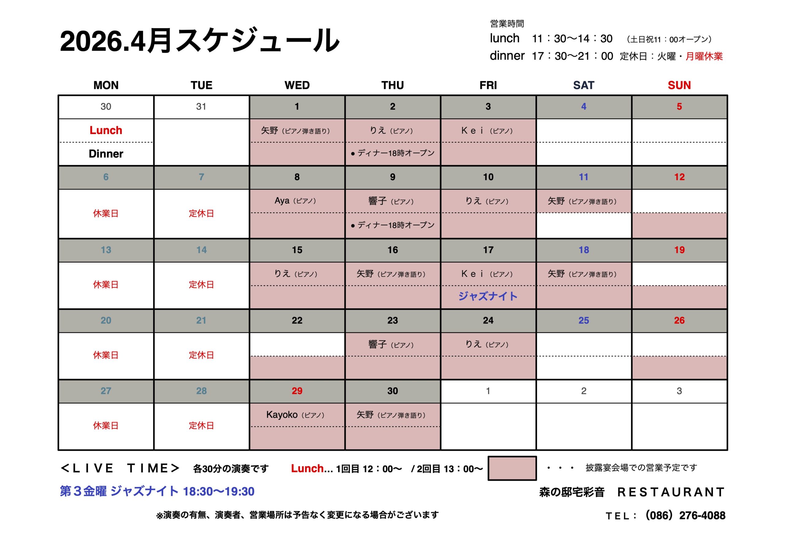毎月第3金曜日のディナータイムにジャズナイトを開催します。毎回3名の演奏者を招いて18:30から1時間の特別演奏を行います。通常のディナーご予約をいただくのみで、特別料金はかかりません。 ハーフコース(ディナーAコー […]