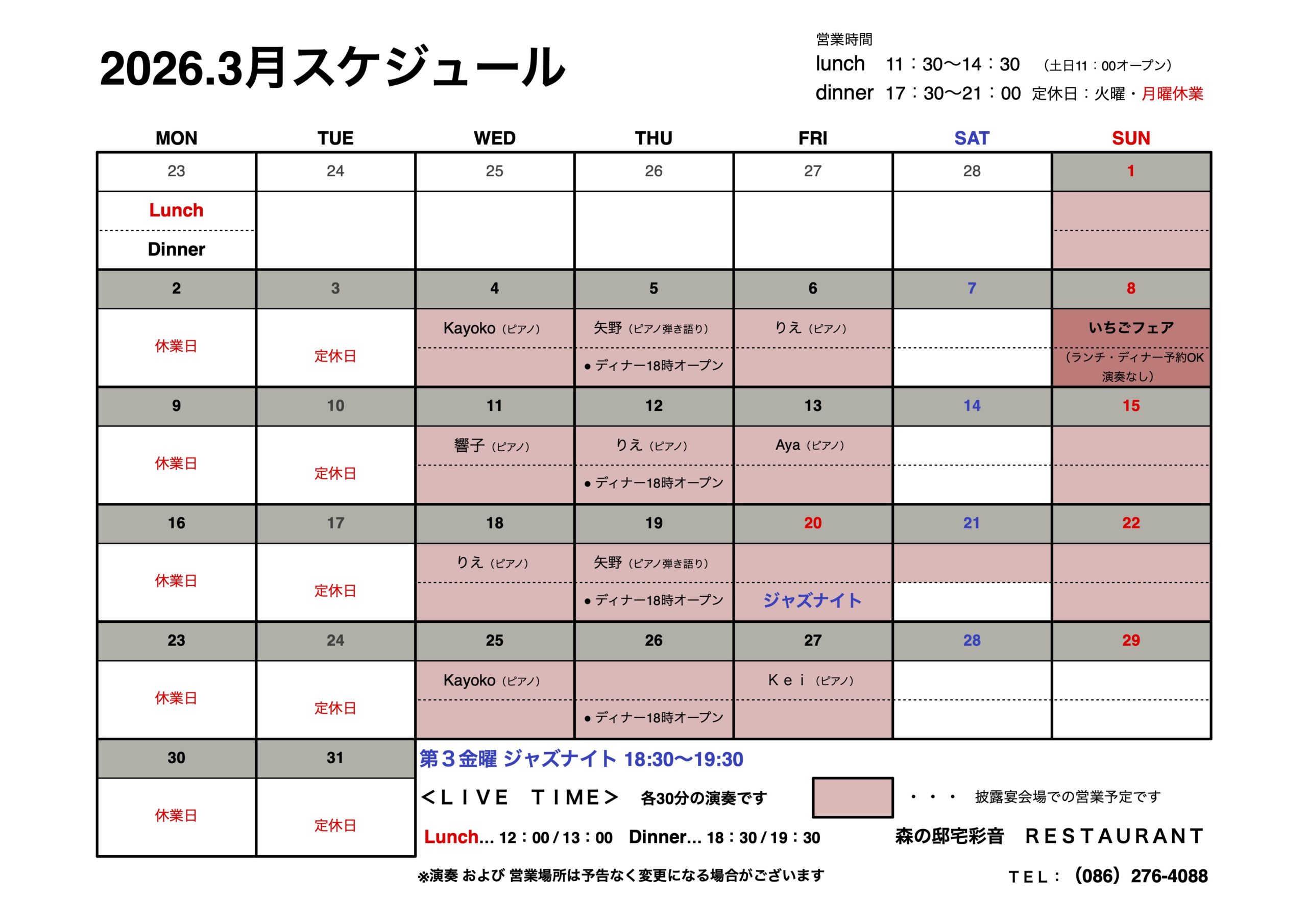 3月8日(日)、いちごフェアを開催します。軽食ビュッフェ&いちごスイーツが2時間の食べ放題です。 ※1部・2部ともに満席になりました。 森の邸宅彩音レストラン086-276-4088 ※写真は過去に開催された、い […]